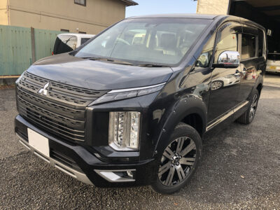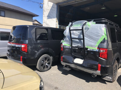 ミツビシから納車前の新車が運ばれてきてフロントグリルの塗装と社外のオーバーフェンダーの塗装、取付け。オーナーさんによって追加の作業がはいる。