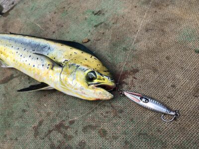 シイラに。この時はリアのフックにも掛かっていて2匹同時に釣れた。
