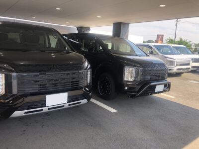 三菱の営業さんに工場まで車を運んでもらいました。・・・この仕事始めたころは全部運んでもらっていたのですが店先でやったほうが新車を動かすリスクもなく楽だというのに気が付いた。